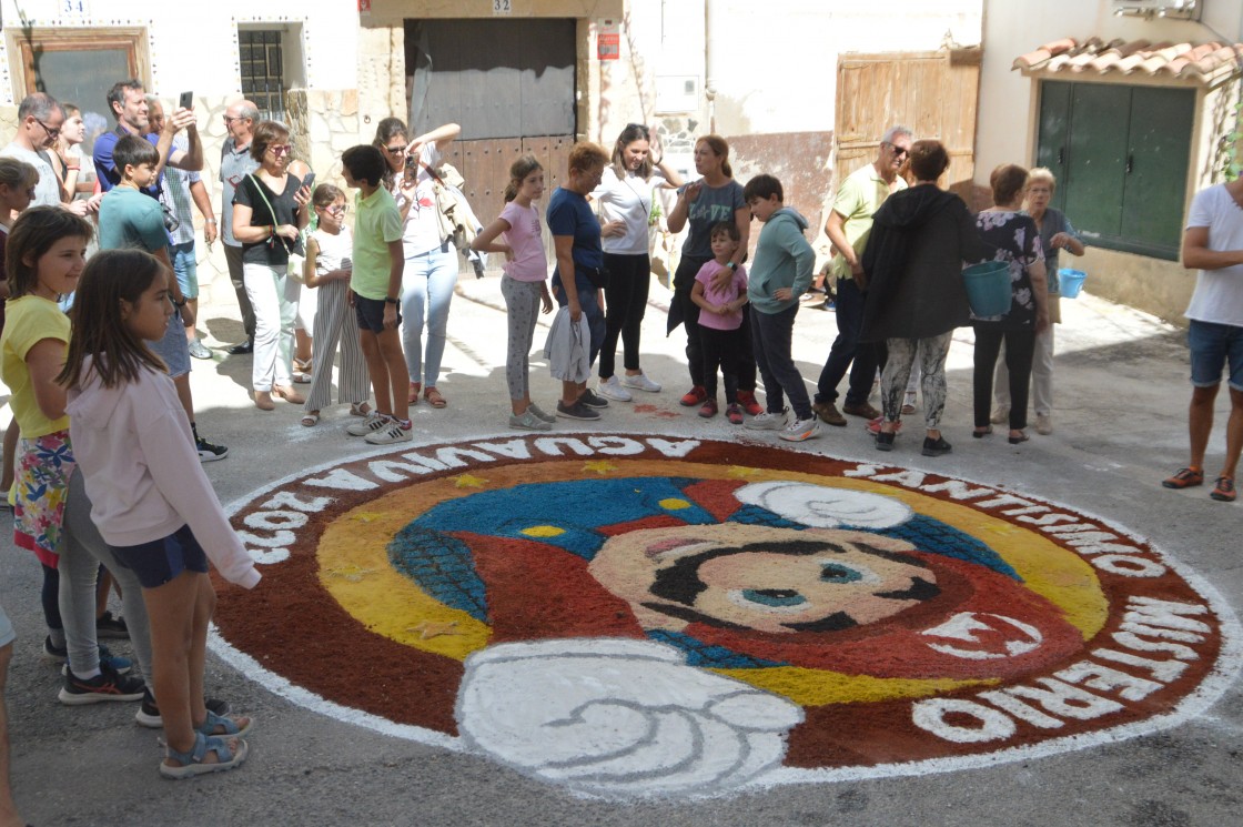 El viento jugó una mala pasada a los alfombristas de Aguaviva, que tuvieron que mojar el serrín con fumigadores constantemente para evitar que las corrientes se lo llevaran. En la parte alta, la de la iglesia, no se pudo espolvorear en esta ocasión. “Ha sido muy fastidioso, creíamos que hoy no lo sacábamos”, dijo Valencia.