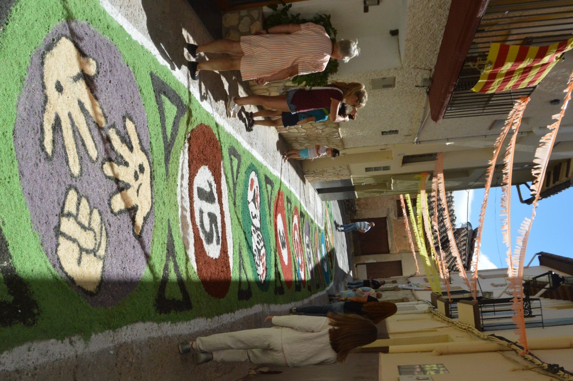 “Nos ha fastidiado un poco el viento, pero no pasa nada porque lo hemos vuelto a hacer”, se enorgulleció el joven Adrián Margelí, que volvió a levantarse temprano para comenzar a las 7:45 horas su tapiz en las calle Mayor y del Pilar. Antes de las 12:00 estaba terminado entre todos. “Lo hacemos con mucho orgullo. Desde el primer año de vida lo vas aprendiendo y poco a poco vas cogiendo el relevo. Cada vecino se encarga de hacer su calle y, los que vienen de fuera o son de otras calles, se unen a amigos o familiares para ayudarse entre todos”, continuó Margelí.