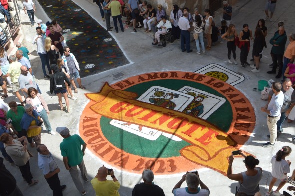 Este año, la temática de las alfombras eran los juegos. “Pensamos en hacer juegos de mesa y al final han sido juegos en general, teniendo en cuenta que el principal es el guiñote, que es el juego de la comarca. Luego surgió el ajedrez, los puzzles, el parchís, el dominó, algo de arcade antiguo y moderno, de teléfono, también está el Fornite o el Pac-Man, así como juegos de calle”, enumeró.
