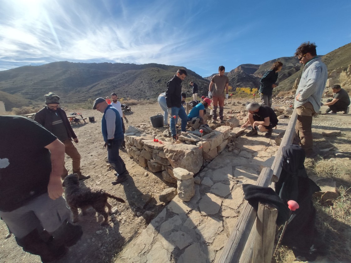 La jornada comenzó el sábado en unas antiguas eras tradicionales, donde el equipo director explicó cuál sería la tarea a realizar, que consistió en esas primeras horas en la construcción de un murete de piedra seca o calzada de contención y separación de dos eras en distinta elevación, donde se ubica un mirador y caseta de observación de las aves en la cola del embalse de Cueva Foradada.