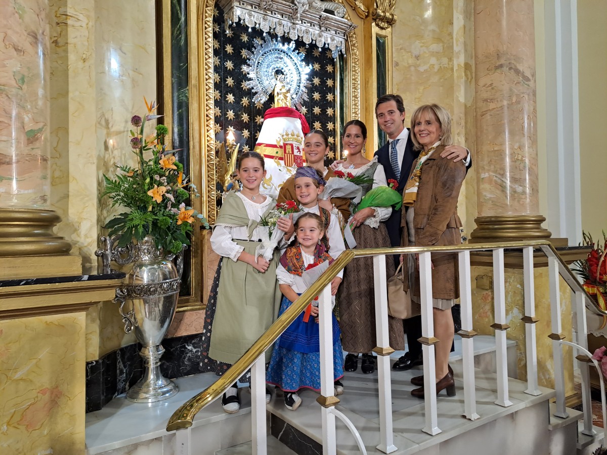 La familia al completo se desplazó después a la plataforma con la imagen de la virgen en la plaza de España, donde se realiza la ofrenda cuando hace buen tiempo, para no perderse tampoco esta fotografía. “Es una pena el tiempo pero por lo menos tenemos la foto de todos los años. Venimos toda la familia y da un poco de pereza con agua, pero la tradición es la tradición. El año pasado nos lo saltamos porque nos costó vestirnos, pero este año había que cumplir sí o sí”, subrayó José Manuel Ponz Alfranca.