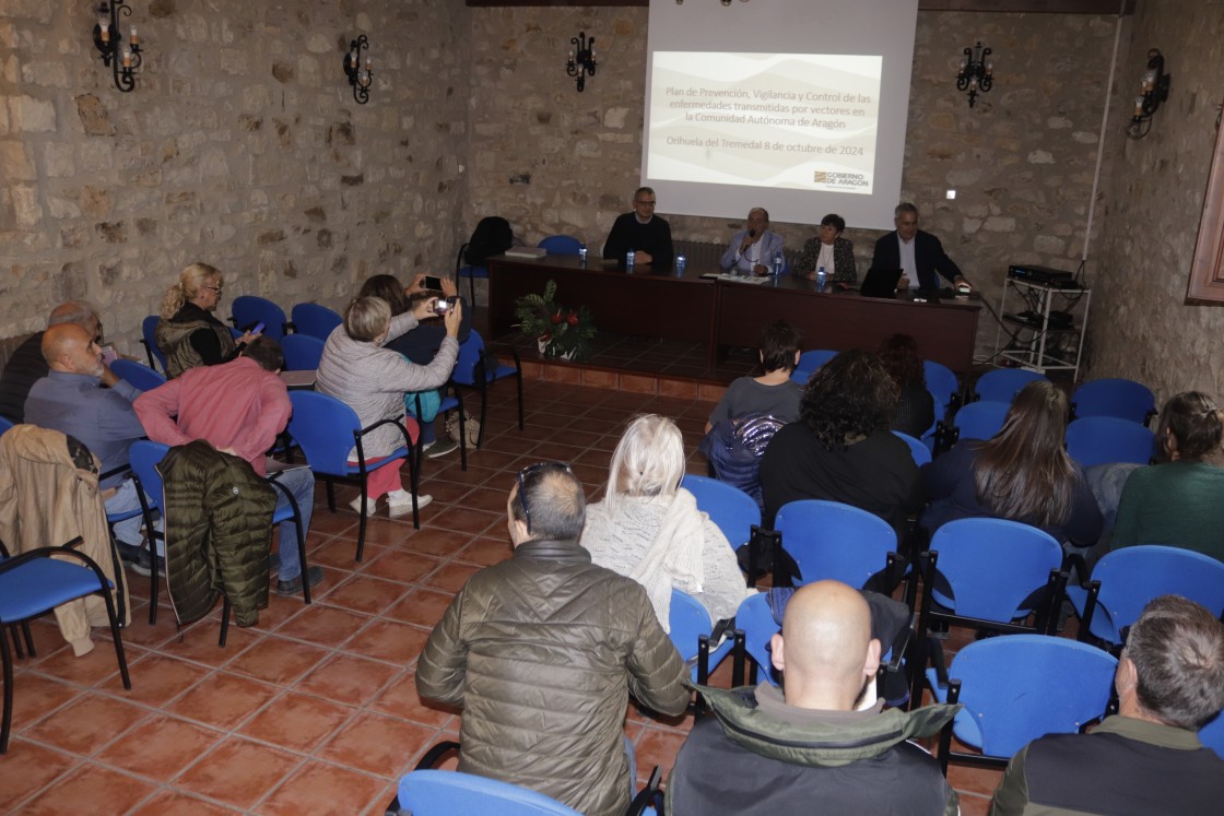 La directora provincial de Sanidad en Teruel, Asunción Navarrete, el jefe del Servicio de Seguridad Alimentaria y Sanidad Ambiental del Gobierno de Aragón, Antonio Español, y el profesor titular de Sanidad Animal de la Facultad de Veterinaria de la Universidad de Zaragoza y director de la Cátedra de Investigación en Plagas Urbanas y Salud Pública, Ignacio de Blas, participaron este martes en una reunión celebrada en la Residencia de Tiempo Libre Orihuela del Tremedal para dar a conocer este plan piloto. También participaron el alcalde de Orihuela del Tremedal, Rafael Samper, los directores provinciales en Teruel de Medio Ambiente, Emilio Pérez, y Agricultura, Elifio Feliz de Vargas, y técnicos del Departamento de Sanidad y de las tres direcciones provinciales de Sanidad, Medio Ambiente y Agricultura en Teruel, así como de la Universidad de Zaragoza