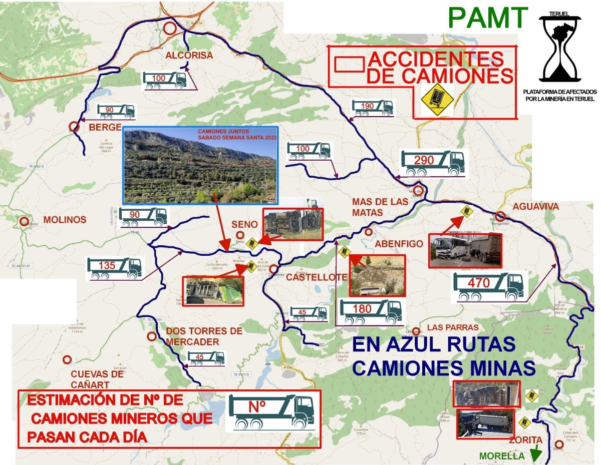 Según los datos recogidos por la plataforma, pasan más de 550 vehículos diarios por Aguaviva, por donde pasa casi todo el tráfico procedente de las minas del Bajo Aragón. La plataforma ha elaborado una infografía que detalla el paso de camiones por las carreteras.