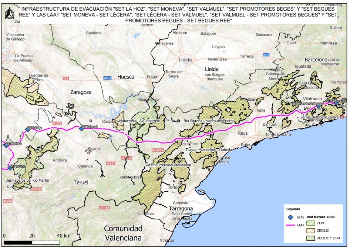 Por otra parte, la MAT afecta a varios espacios de la Red Natura 2000, entre ellos la Zona de Especial Conservación (ZEC) Río Matarraña y la Zona de Especial Protección de las Aves (ZEPA) Matarraña-Auguabarreix, así como a la XEPA Desfiladeros del río Martín en la provincia de Teruel, En la parte catalana hay otras zonas sensibles del medio natural que se ven afectadas (ríos Siurana y Gaià y las sierras del Litoral central, entre otras).