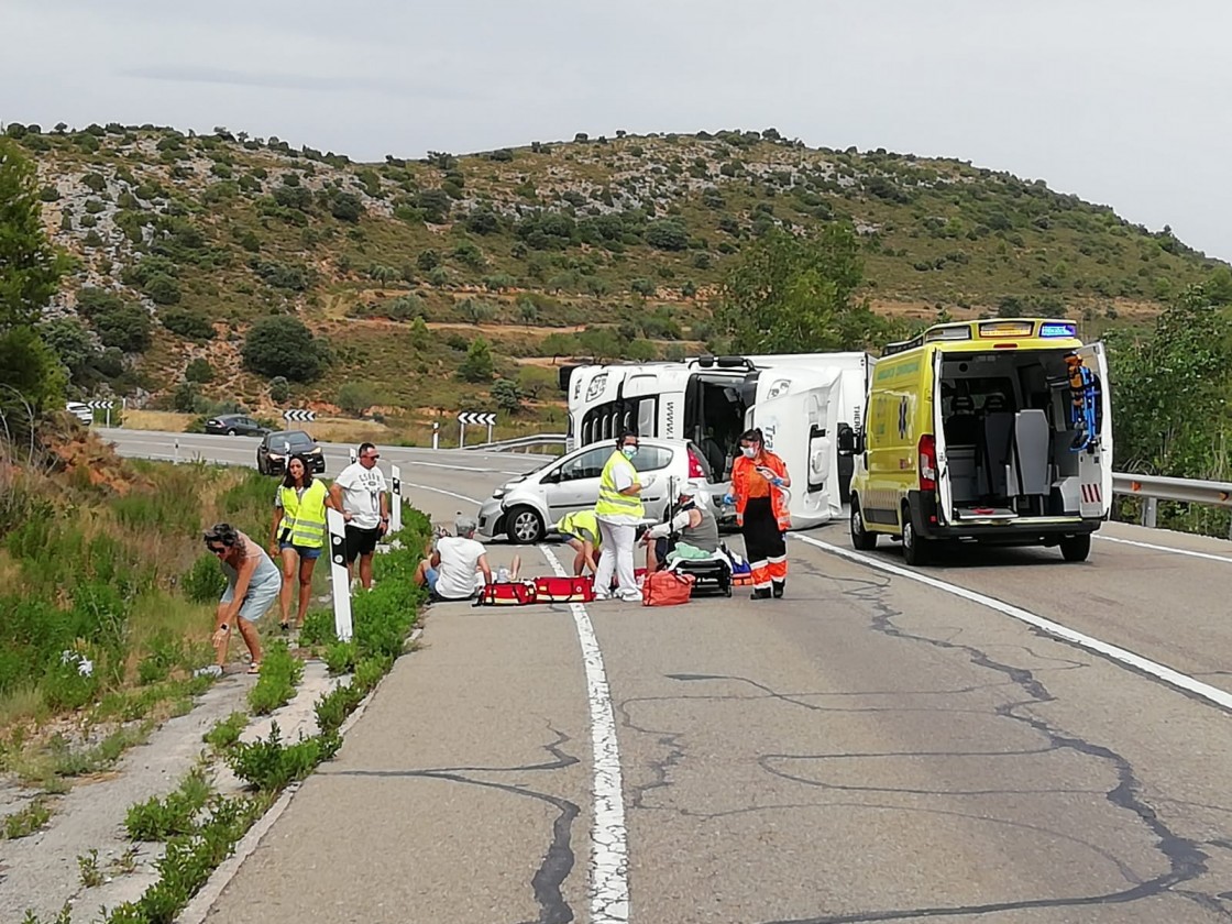 El accidente tuvo lugar a las 11:20 horas de este sábado, en el kilómetro 202,3 del citado vial, según informaron fuentes de la Guardia Civil. Un camión que transportaba canales de cerdo invadió el carril contrario y acabó volcando en una curva cerrada a un kilómetro de Los Olmos, en dirección hacia Alcorisa.