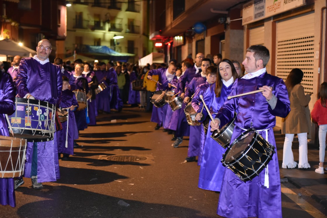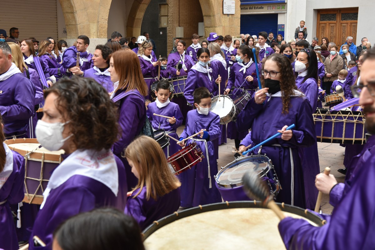 La lluvia dio una tregua en la tarde-noche del sábado y los tamborileros de la Ruta del Tambor y Bombo, Teruel y Valderrobres estuvieron a la altura, subiéndose a los autobuses fletados por ayuntamientos y cofradías para participar en el desfile.
