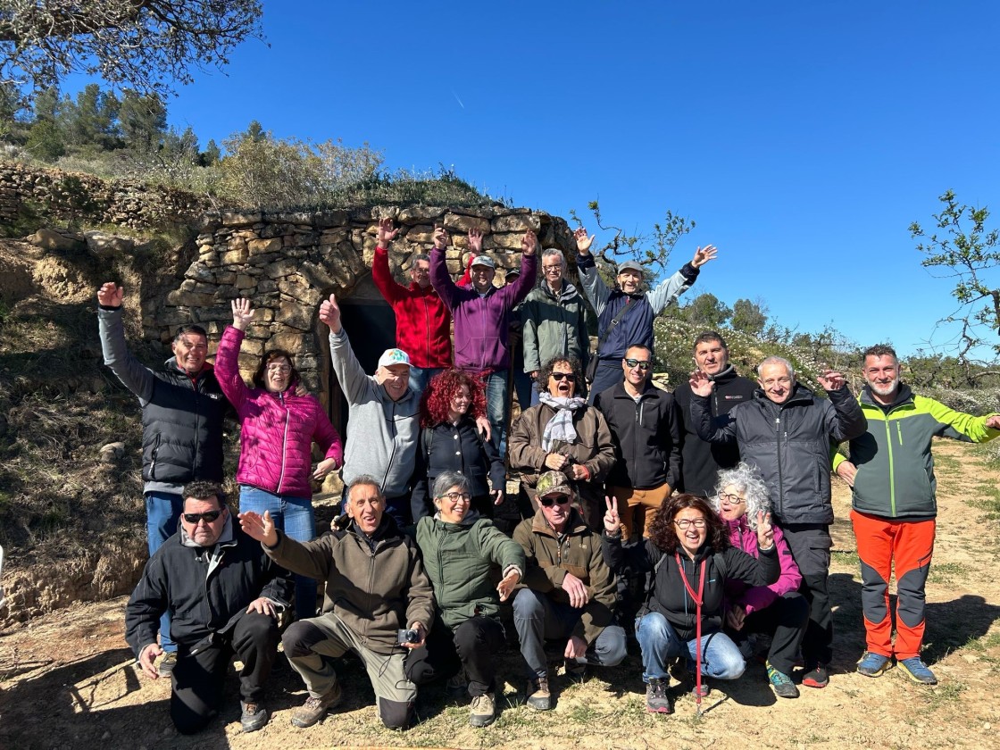 Durante la caminata, se explicó que en Torrecilla de Alcañiz las casetas suelen estar “más trabajadas”. El grupo reflexionó también sobre cómo se conseguían las piedras necesarias para estas construcciones. En el pasado, el primer paso era limpiar el monte mediante la quema controlada de la vegetación. Después, se recogían las piedras esparcidas por el terreno y se organizaban para levantar terrazas y muros, rellenando la altura con tierra antes de proceder a la plantación de cultivos. Este método se utilizó durante siglos, y hasta los años 70 apenas había árboles en la zona, ya que la cebada y el trigo eran los cultivos predominantes. No fue hasta entonces cuando se empezó a plantar almendros, cambiando por completo la fisonomía del paisaje.