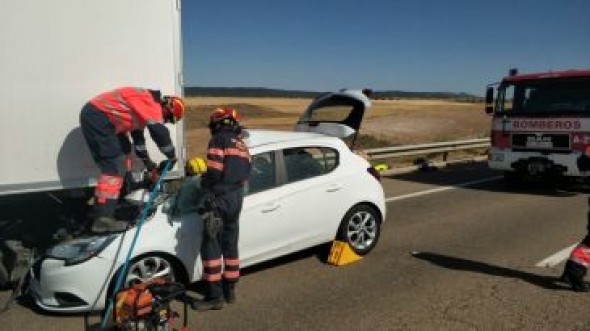 Bomberos de la Diputación de Teruel han intervenido este lunes en un accidente que se ha producido en la A-23, entre Caudé y Cella, en sentido Zaragoza y en el que se han visto implicados dos camiones. El 112 ha dado el aviso al Parque de Teruel en torno a las 15:40 de que se había producido una colisión por alcance entre dos camiones. Al llegar al lugar los efectivos, los conductores de los...