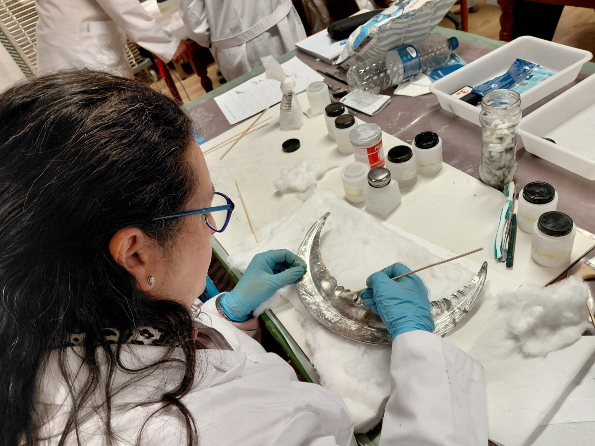 Otro de los trabajos fue la limpieza de sulfuraciones de una pieza decorativa con forma de luna menguante en plata, posiblemente del siglo XVIII y que estaba en muy buen estado, aunque presentaba suciedad debido al paso del tiempo. “La plata se queda negra, hay que limpiarla y renovar el barniz de vez en cuando”, comentó María Méndez.