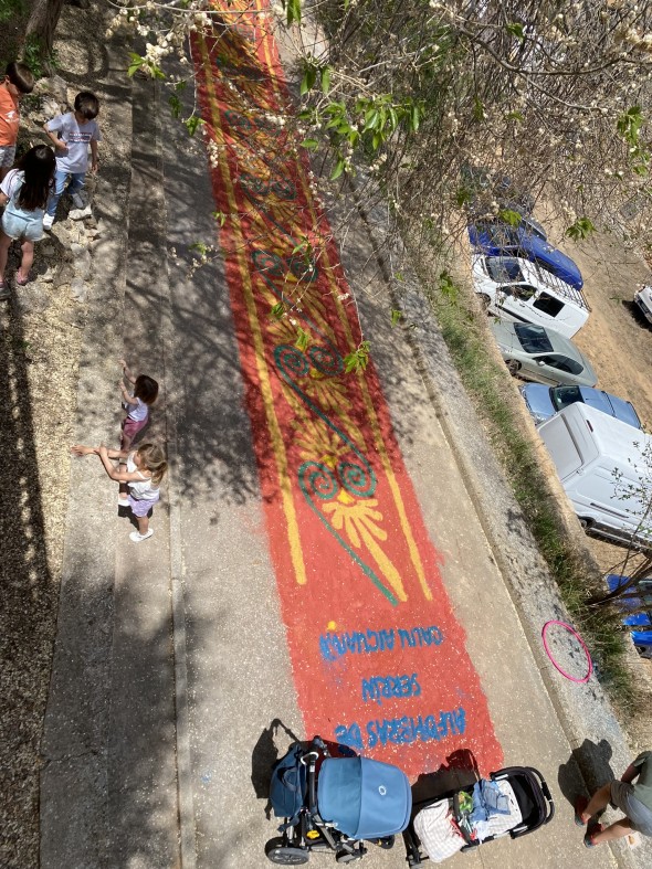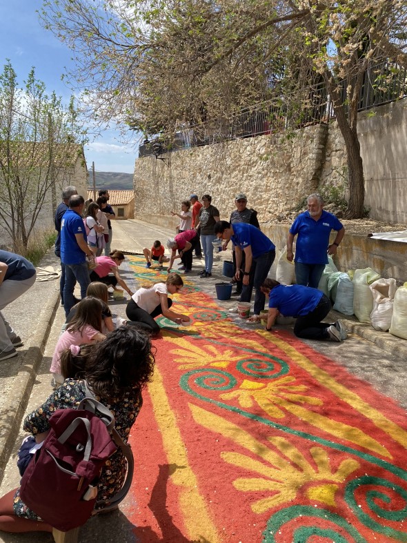 En paralelo, varios miembros de la Asociación Cultural Caliu, con el apoyo del Ayuntamiento de Aguaviva, hicieron una alfombra de serrín coloreado como las que cada 28 de agosto cubren las calles de su localidad con motivo de la festividad del Santísimo Misterio, declarada recientemente Fiesta de Interés Turístico de Aragón.