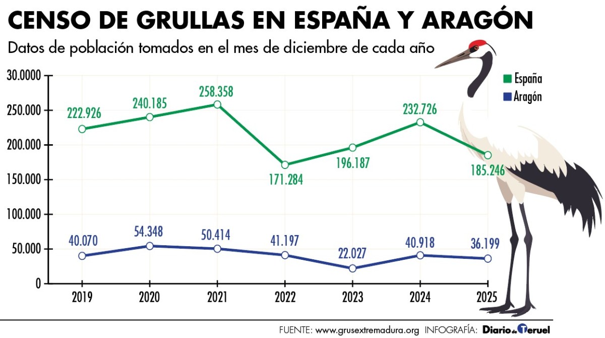 Cambios en los cultivos y aumento en las temperaturas que provocarán que cada año el número de grullas sea menor, algo que los expertos indican que ya se observa en los censos realizados en las últimas campañas. “Las grullas viejas seguirán viniendo porque son muy tradicionales, pero los jóvenes tendrán tendencia a quedarse más arriba”, concluye José Antonio Román.