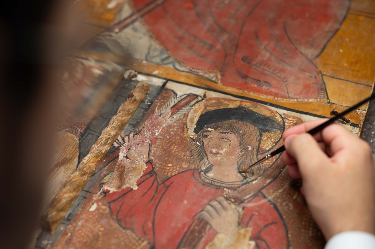 Una de las labores realizadas ha sido la construcción de un armazón externo, que no toca la estructura original, para sostener las tablas, que estaban separadas unas de otras cuando llegaron al taller. Además, a las tablas se les han realizado injertos perimetrales para mejorar su volumetría, ya que presentaban numerosas pérdidas.