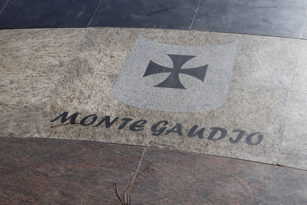 El símbolo de la Orden de Monte Gaudio es una cruz ensanchada o patada roja. En ocasiones se sustituía por la misma cruz en blanco (también se ha llegado a representar con una cruz mitad roja y mitad blanca de ocho puntas, similar a la de Malta, que no es medieval.