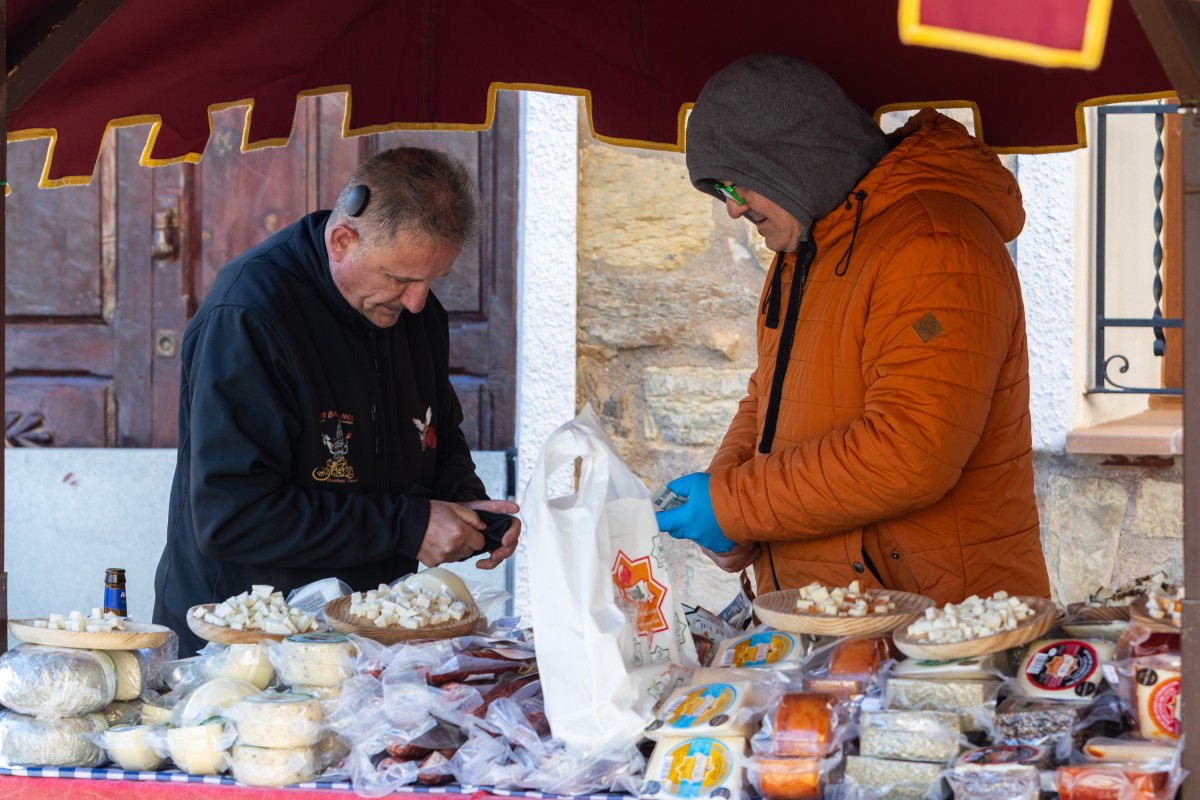 Entre otros productos de calidad, destacaba la presencia de los quesos Guara, de la localidad oscense de Las Almunias de Rodellar, y La Val, de Mezquita de Jarque. El maestro quesero de esta última, Gabriel Coman, se mostró encantado de poder ofrecer sus productos al lado de casa y aseguró que en todas las ferias a las que acude en la provincia de Teruel le va bien porque la gente ya los conoce.