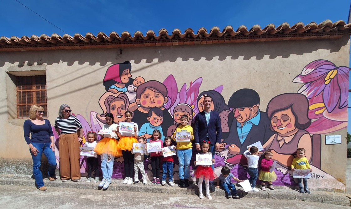 Además, en esta ocasión la actividad contó con el apoyo de los niños del colegio, que tuvieron la oportunidad de colorear sus propias pinturas, aunque en un folio, e interpretar a su manera el mural de Castillo. La pintura representa a varias generaciones unidas por la tradición de esbriznar rosas de azafrán.