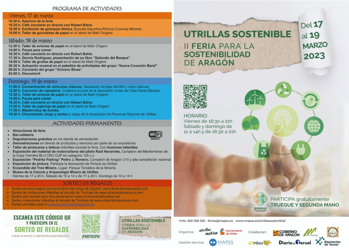 Tendrá lugar en el pabellón de festejos de la localidad con la presencia de 60 expositores y marcas representadas y numerosas actividades paralelasUtrillas acogerá del 17 al 19 de marzo la segunda edición de Utrillas Sostenible, Feria para la Sostenibilidad de Aragón, cuyos argumentos principales serán los Objetivos de Desarrollo Sostenible de la Agenda 2030, una iniciativa impulsada por Naciones Unidas para dar continuidad a la agenda de desarrollo tras los Objetivos de Desarrollo del Milenio (ODM). Son 17 objetivos y 169 metas propuestos como el cambio climático, la desigualdad económica, la innovación, el consumo sostenible, la paz y la justicia, entre otras prioridades.