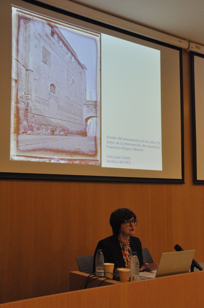A continuación intervino Ascensión Hernández, catedrática de Historia del Arte de la Universidad de Zaragoza, que ofreció muchos datos sobre los trabajos que se llevaron a cabo para restaurar la Parroquieta de La Seo en Zaragoza, tanto en su muro exterior, una obra mudéjar única y muy conocida, como el templo anexo. Ese muro ofrecía un estado muy deteriorado en los años 20, con las ventanas originales tapadas y otras abiertas en diferentes momentos históricos. Su restaurador fue Francisco Íñiguez Almech, uno de los grandes expertos del momento, que además aplicó técnicas y tomó decisiones muy avanzadas a su tiempo, que convierten esta restauración “en un excelente proceso, digno de estudio, por su valor técnico y conceptual”.