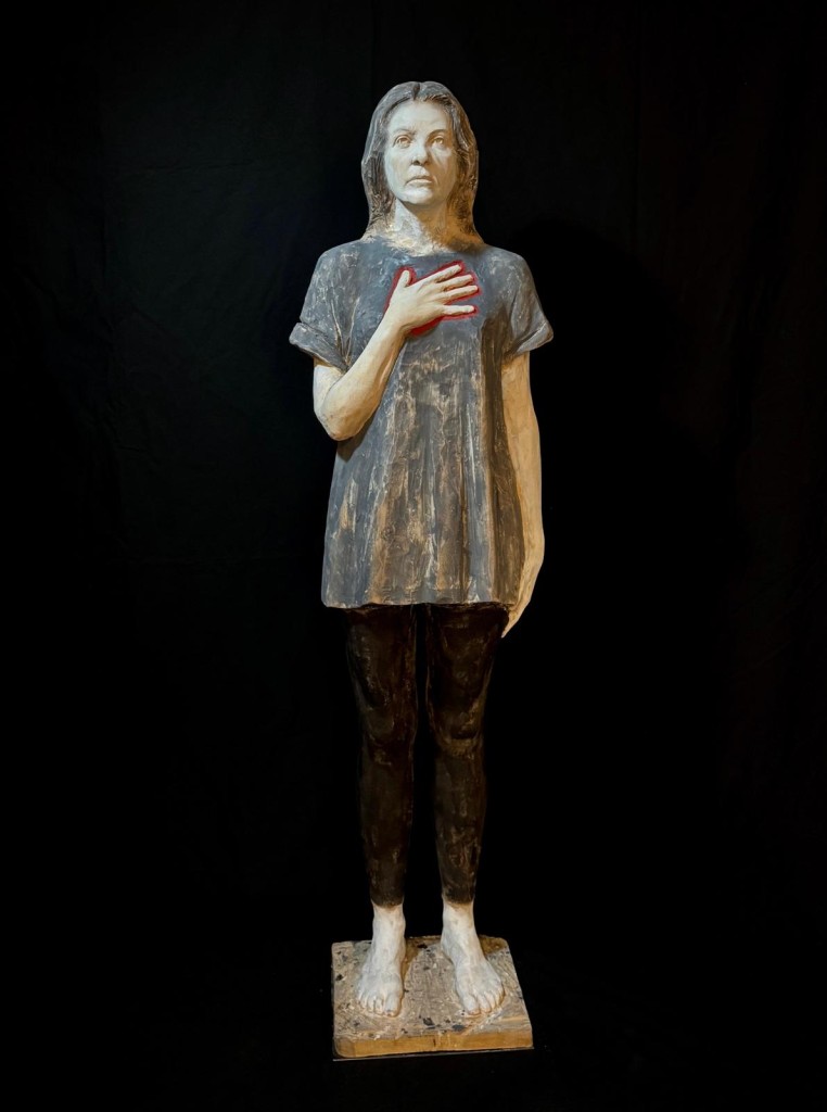 Koré, su última obra premiada, es la manera que tiene de decir yo estuve aquí. Es una figura femenina erguida, retrato de su esposa, con la mano sobre el pecho pintada en rojo, un detalle cargado de simbolismo. Esa escultura fue realmente su Trabajo Fin de Máster, realizado poco después de la pandemia. La presentó al Premio Reina Sofía y formó parte del grupo selecto de sesenta obras que son seleccionadas, de entre los centenares que se presentan de todo el mundo. En virtud de ello, Koré participó en la exposición anual de las obras seleccionadas del Reina Sofía, que tuvo lugar en 2022 en la Casa de Vacas, en el parque del Retiro de Madrid.
