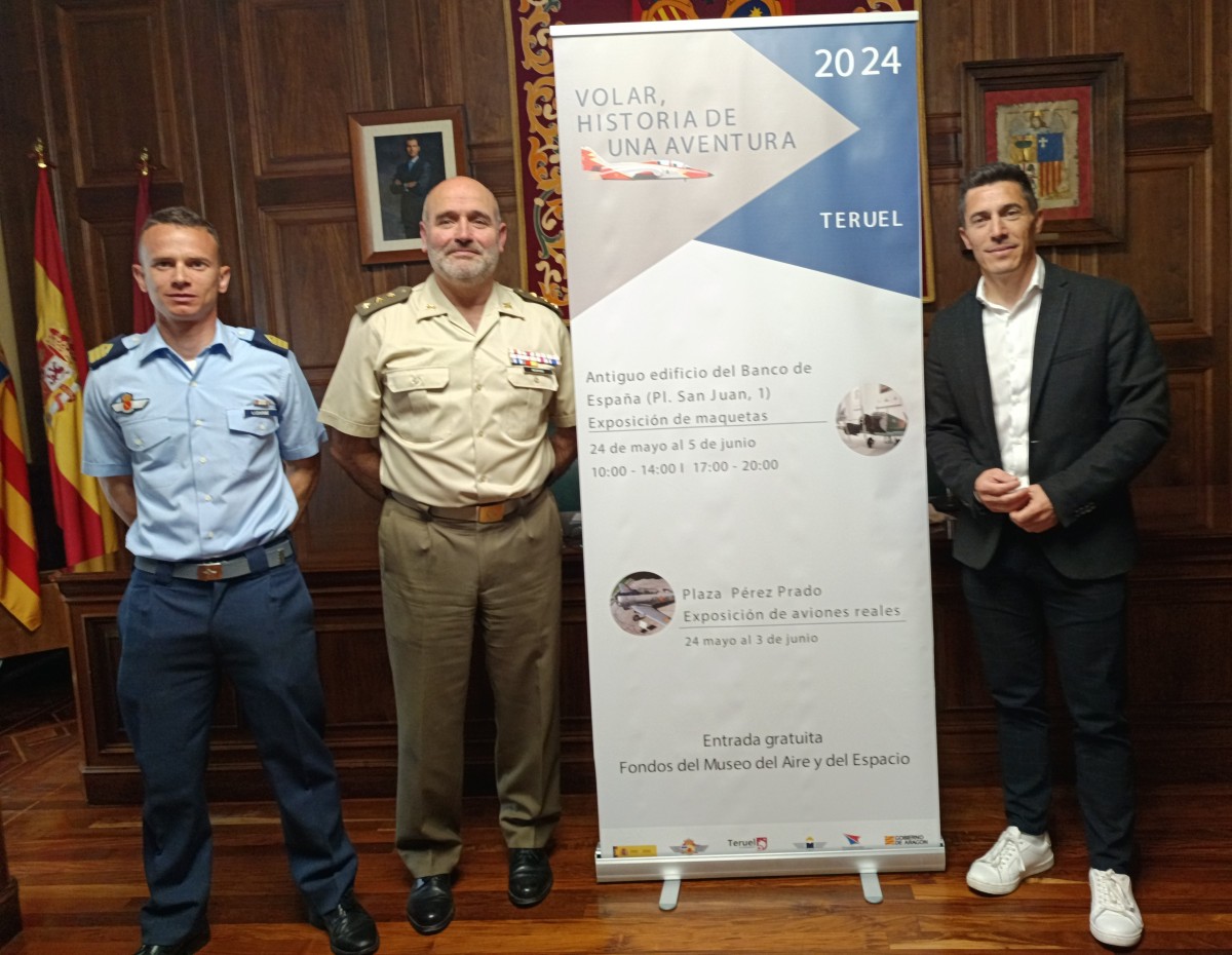 Con el título Volar, historia de una aventura, desde este viernes se puede visitar en Teruel una exposición sobre el pasado y el presente del Ejército del Aire y del Espacio. La ciudad y muchos turolenses han estado ligados a este ejército por el antiguo campo de tiro de Caudé y para recordar esos tiempos y con el objetivo de afianzar el vínculo con la aeronáutica, llega a Teruel esta muestra comisariada por el Museo del Aire y del Espacio de Madrid (MAESP). El concejal de Cultura, Carlos Méndez, el coronel y subdelegado de Defensa, Salvador Medrano, y el sargento Lizarre, del Ejército del Aire, dieron este miércoles a conocer la exposición formada por piezas procedentes de sus colecciones, además de dos antiguas aeronaves que se están instalando en la plaza del Seminario.
