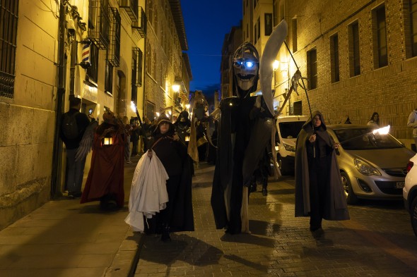 Las tenues luces de las antorchas, las capas oscuras de los participantes, el sonido de instrumentos tradicionales, y el paso lento por las calles más antiguas y estrechas de la ciudad dieron a este desfile un carácter solemne.