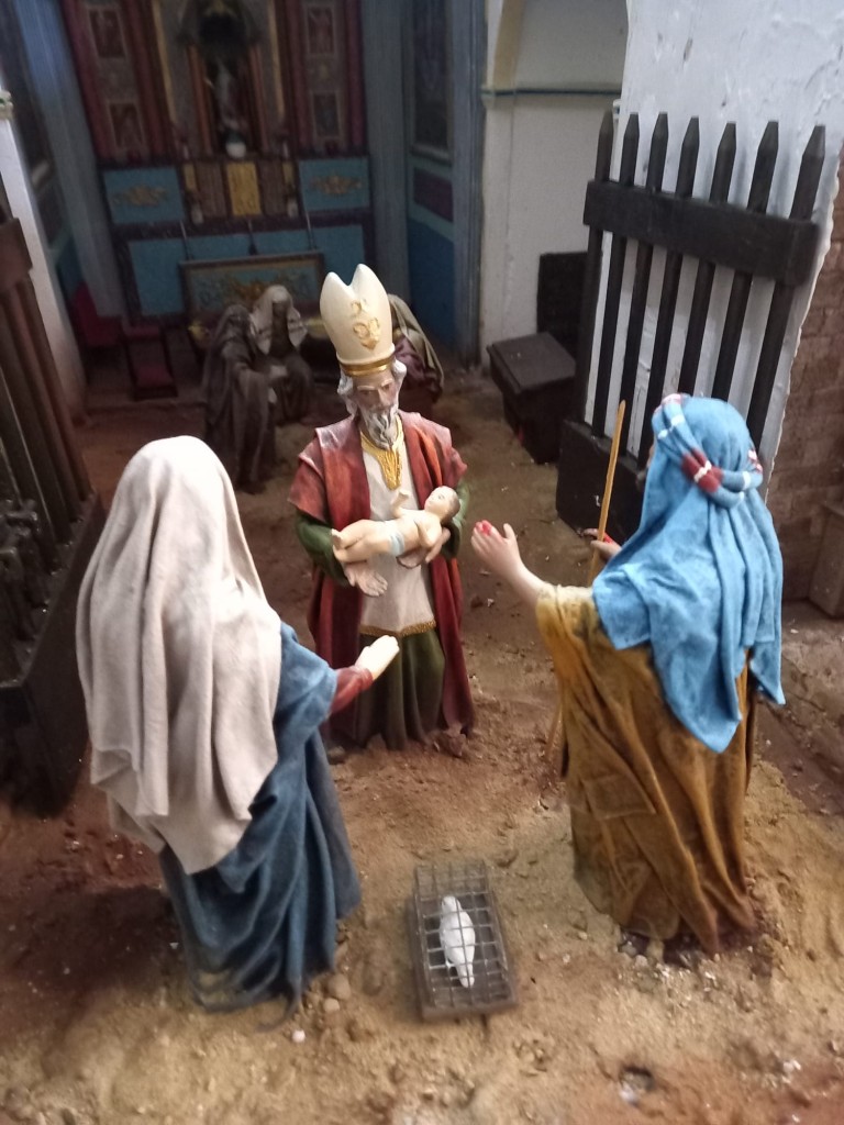 El belén se monta en el templo desde hace 12 años. Y cada vez se organiza de una forma diferente con nuevos escenarios. En esta ocasión, los voluntarios han elaborado una reproducción de la ermita de la Virgen de la Balma, otro de la ermita de Santa Flora e incluso del Tesoro de Petra. “Ha habido innovaciones”, explicó con orgullo Eugenio Añón, uno de los encargados del belén de Mas de las Matas, que señaló que cada año se incorporan nuevos escenarios, algunos de ellos reproduciendo lugares del municipio o de sus alrededores. “La renovación ha sido sobre tres monumentos, con tres cosas del pueblo que son muy queridas”, explicó. Uno de esos nuevos elementos es la ermita de Santa Flora, cuyo exterior ya se ha empleado en Nacimientos anteriores pero que en esta ocasión presume de su interior en miniatura con “cómo está decorada, el altar mayor, los altares laterales, las pinturas, cuatro evangelistas que decoran el frontal del altar mayor, etc. Es como la decoración interna pero en miniatura”, abundó el voluntario. Este escenario se utiliza para “presentar allí al niño Jesús en el templo. Como es un templo, esa escena evangélica se hace allí”, relató el voluntario.