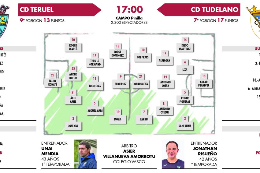 La buena noticia del regreso a la titularidad de Moha Sanhaji, ya totalmente recuperado de su rotura de isquio, le permitió a Unai conformar un once más parecido al del inicio de la temporada con Théo Le Normand regresando al centro del campo. No obstante, la importante baja de Cabetas en la zaga le obligó a tener que tirar de recursos. De esta manera, el CD Teruel salió de inicio con Taliby en la portería, José Val y Áxel Ariel en la pareja de centrales, Ander Dufur y Roger Marcé en los laterales, Óscar Carlo, Miguel Marí y Théo Le Normand en la medular, Moha y Jorge Domínguez en los extremos y Peru Ruiz en la punta de lanza.