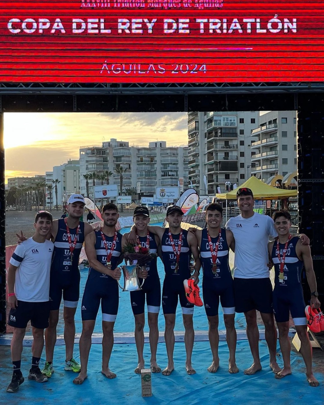 Izan Edo (cuarto desde la izda.), junto al resto del equipo de la UA. @uatriatlon