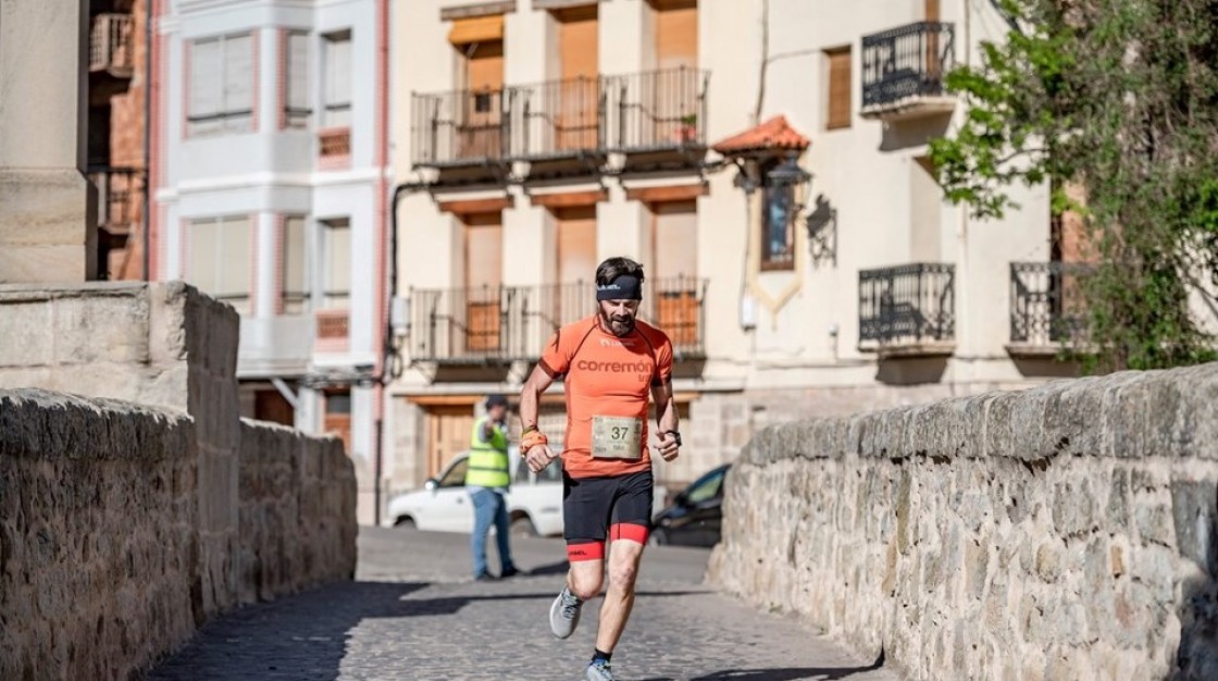 Uno corredor cruza un puente medieval en al Media Maratón de Mora de Rubielos. Last Race Studio