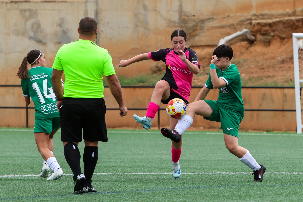 Volvió a tocar a rebato el once de Rubén López, y la presión de sus delanteras empezó a generar espacios de nuevo entre la defensa verde. Importante fue en este sentido la aportación de Estela Cantero, que relevó a Lázaro y se vació en su trabajo en punta de ataque y entre líneas. Presionó y descargó, y empezó a generar espacios y balones filtrados que asustaron a las visitantes. Giménez estuvo a punto de aprovechar uno de ellos, se le adelantó la portera zaragozana in extremis. Otro avance vertical de la exterior turolense terminó con disparo despejado junto al palo del Casablanca.