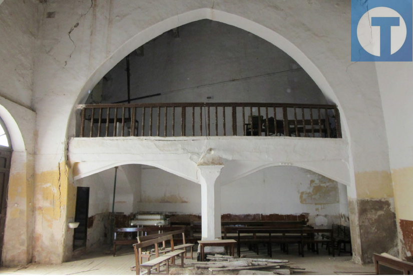 Vista del coro, que presenta un estado deplorable con grietas y humedades