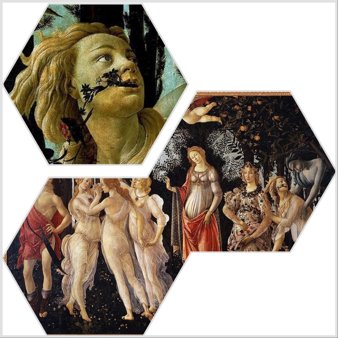 Si esta representación de la primavera nos abruma por su belleza musical, en la pintura, la que mejor representa la estación es sin duda, la Alegoría de la primavera de Sandro Botticelli, obra maestra donde el artista del Quattrocento italiano hace gala de su estilo refinado, lleno de minuciosos detalles, poniendo ante nuestros ojos todo el acervo humanístico que brilló en la corte de Lorenzo el Magnífico. Cuenta con imágenes en esta tabla un bello relato mitológico y ante nuestros ojos aparece un jardín celestial adormecido, hasta que una historia de amor y renacimiento lo despierta a la vida. Aquí no escuchamos al enamorado viento de Céfiro, sino que lo vemos ya personificado, mientras sopla sobre su amada la ninfa Cloris, que lanza por su boca exhalaciones de rosas y anémonas, a la vez que se convierte en Flora, diosa de las flores y los jardines, coronada de violetas y acianos, con un manto plagado de rosas, acompañando a Venus, recreándose el pintor en las túnicas de aspecto mojado y brindando a sus figuras un halo trasparente y etéreo. Podemos incluso, casi oler la primavera en ese tapiz floral toscano que aparece a los pies del cuadro, repleto de margaritas, violetas, rosas, amapolas, acianos, jazmines, jacintos, iris y clavellinas.
