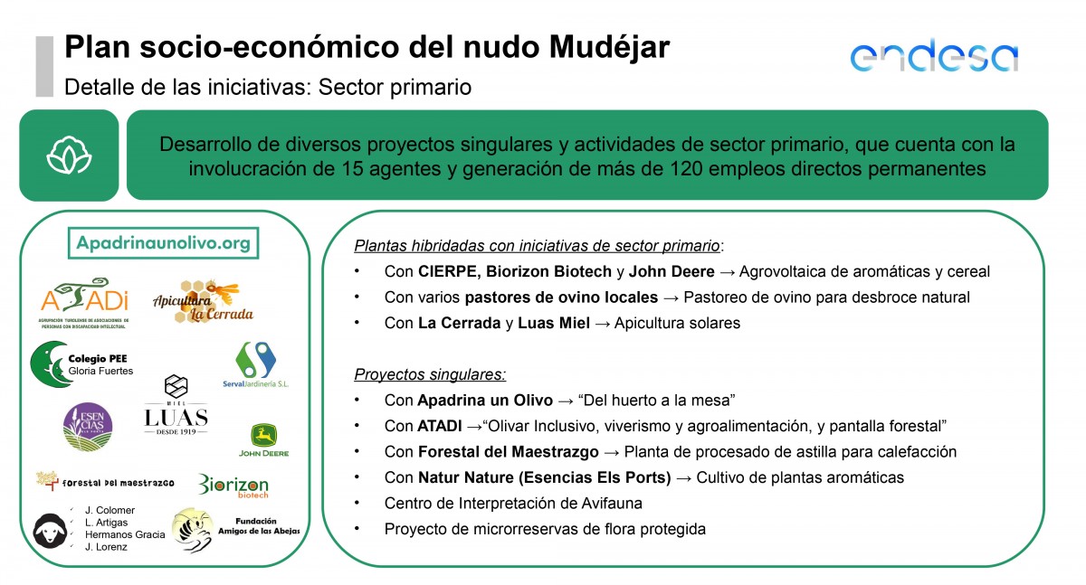 Además de estos proyectos industriales y tecnológicos, Endesa completa su plan de desarrollo socioeconómico con iniciativas enmarcadas en el sector primario y de servicios, que fomenten la capacitación y el empleo a través de la diversificación económica aprovechando los recursos endógenos del territorio, que se han ido identificando en ese proceso de escucha activa con los agentes locales.