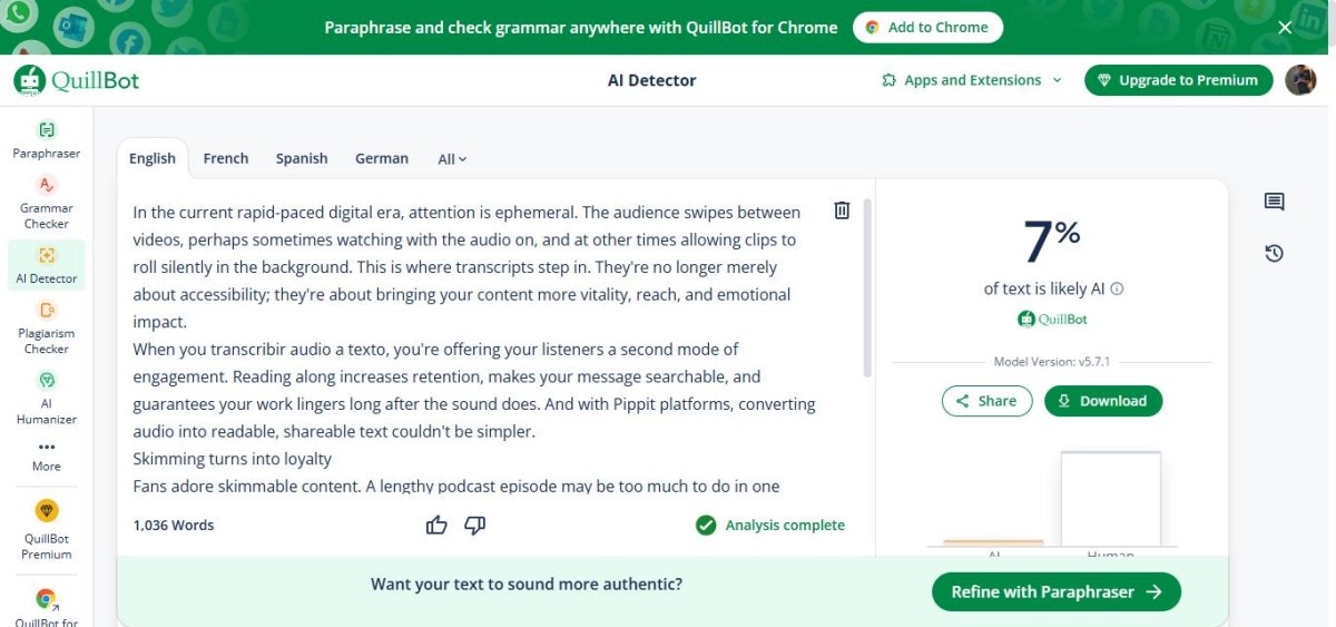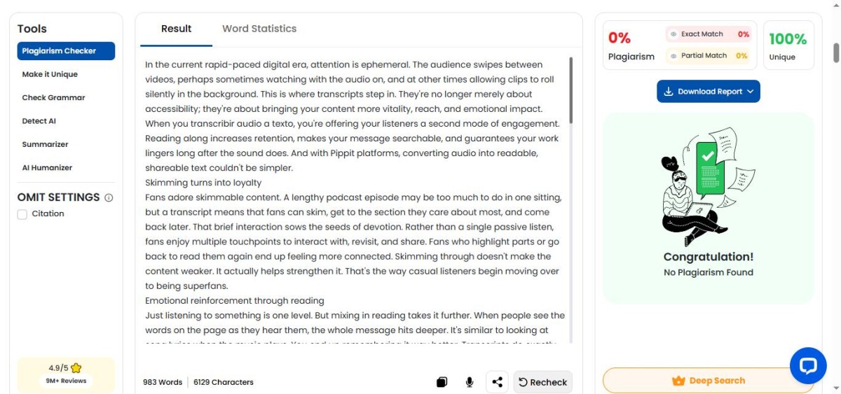 Cuando transcribes audio a texto, ofreces a tus oyentes un segundo modo de interacción. Leer mientras escuchan aumenta la retención, hace que tu mensaje sea buscable y garantiza que tu trabajo perdure mucho más allá del sonido. Y con plataformas como Pippit, convertir audio en texto legible y compartible no podría ser más sencillo.