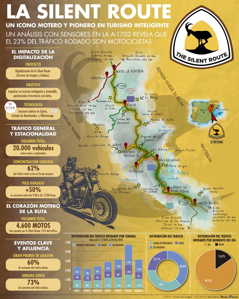 Uno de cada cuatro vehículos que han pasado por la Silent Route entre el 1 de enero y el 30 de septiembre eran motos. De los 20.000 movimientos registrados, 4.600 eran de motocicletas, lo que muestra el elevado potencial que tiene esta ruta. Los datos han sido recabados en el marco del Sitar, el Sistema de Inteligencia Turística de Aragón, que ha monitorizado el recorrido con la colocación de tres sensores ópticos en Cañada de Benatanduz, Ejulve y Villarluengo.