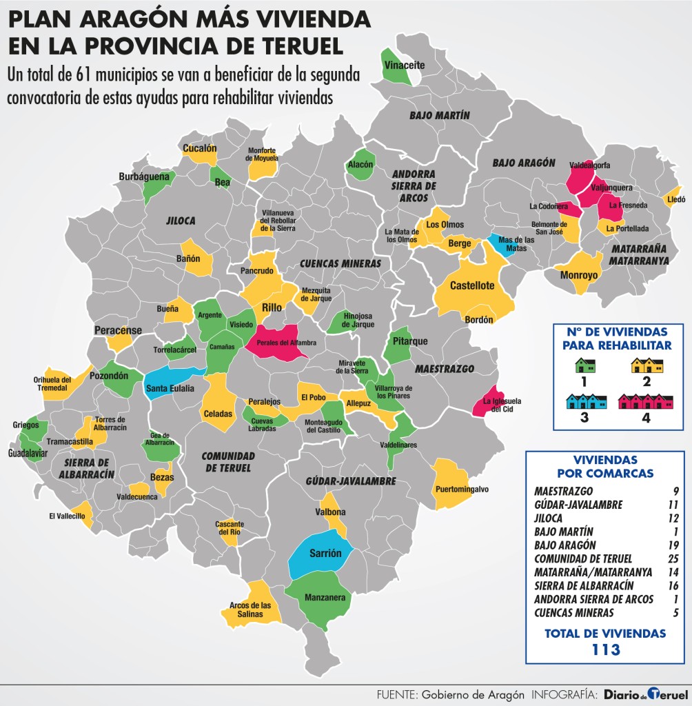 Entre el Bajo Aragón y el cercano Matarraña se impulsarán un total de 33 viviendas, mientras que la redolada de Teruel entre su comarca y la Sierra de Albarracín verá una oferta pública nueva superior a los cuarenta pisos. En este sentido, destaca una importante cantidad de solicitudes del corredor del Jiloca, dentro de que la provincia de Teruel aglutina, en palabras del consejero López, el 60% del total de solicitudes de todo Aragón. De hecho, algunos municipios de la provincia que cumplen los requisitos se han quedado fuera de esta convocatoria porque el presupuesto se ha agotado, casos como por ejemplo los de Cubla, Aguilón, Villarluengo, Rubielos de Mora, Alloza, Caminreal o Gargallo. En otros casos, como Escucha, Fuentes de Rubielos o Vivel del Río Martín, deberán acreditar cumplir criterios en los posteriores llamamientos.