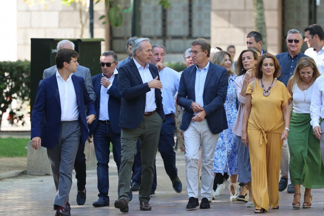 Azcón y Feijóo este jueves en Zaragoza junto a otros representantes del PP. Fabián Simón