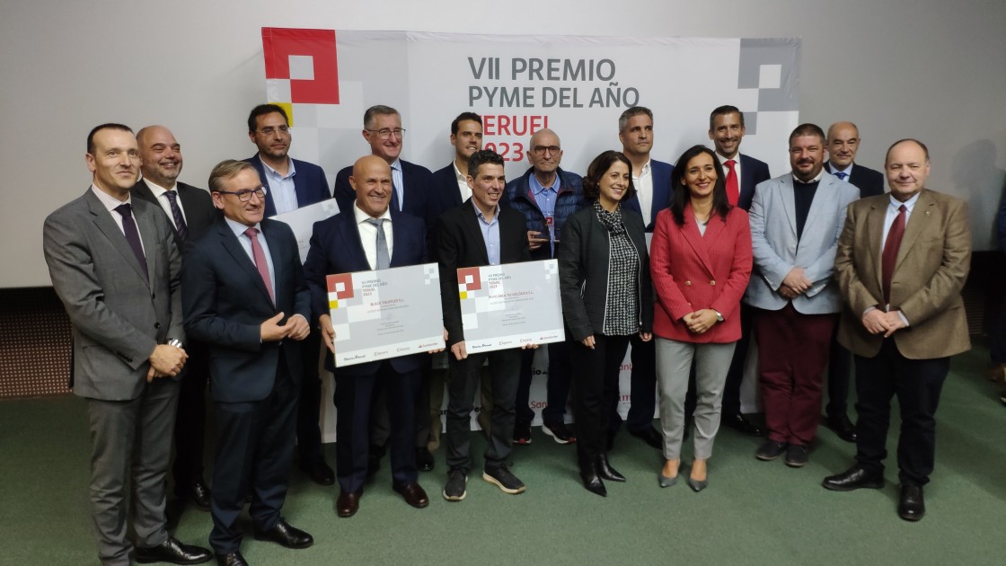Los responsables de las empresas galardonadas Premio Pyme Teruel 2023 posan con los representantes institucionales