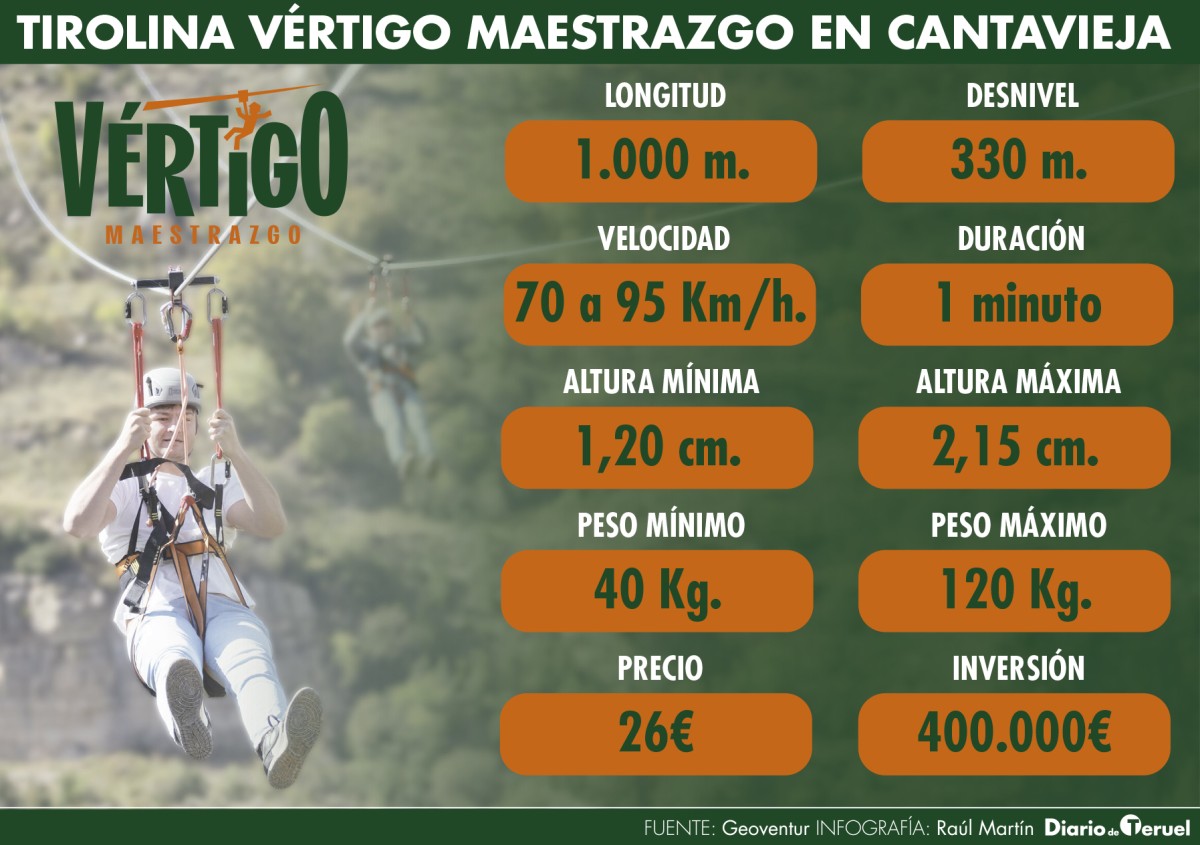 La apertura de la Tirolina Vértigo Maestrazgo de un kilómetro de longitud ha despertado una gran expectación entre los vecinos de Cantavieja y el Ayuntamiento dedicará toda esta semana a ofrecer a los vecinos su uso de forma gratuita. De momento se han apuntado más de 140 personas de diferentes edades, ya que la única limitación que tiene la atracción es tener una altura mínima de 1,20 metros y una máxima de 2,15 metros y no pesar menos de 40 kilos ni más de 120.