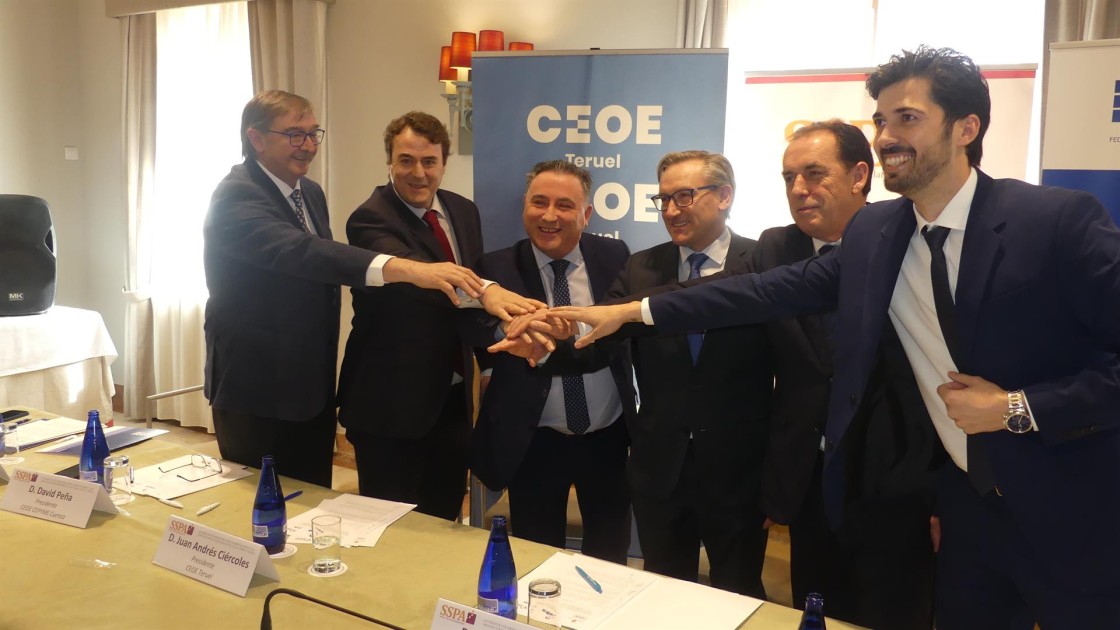 El Parador de Turismo de Teruel ha acogido este martes la firma del convenio mediante el que las administraciones provinciales respaldarán las acciones que las organizaciones empresariales ponen en marcha para fijar población en el marco de la Red SSPA con el fin de luchar contra la despoblación.