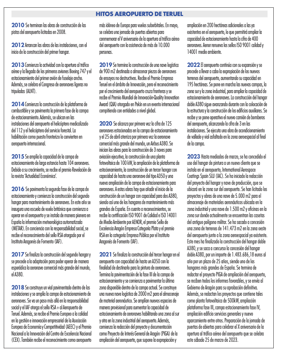 Para eso, argumenta, han sido muy importantes cuatro claves: el acuerdo en el seno del Consorcio entre el Gobierno de Aragón y el Ayuntamiento de Teruel; el impulso a la creación de infraestructuras en función de la demanda de actividad de las empresas; el apoyo de la sociedad turolense hacia esta infraestructura; y la cofinanciación del Aeropuerto a través del Fondo de Inversiones de Teruel (Fite).