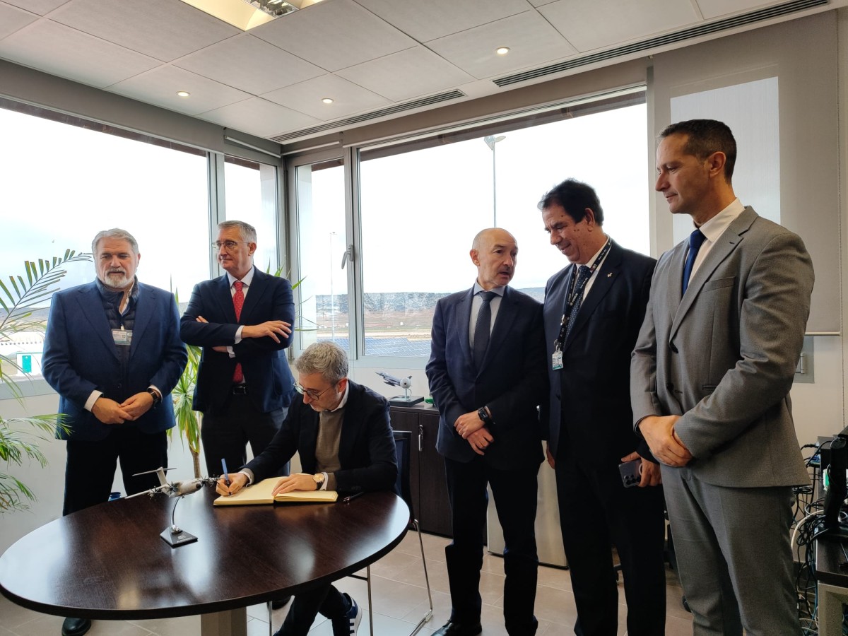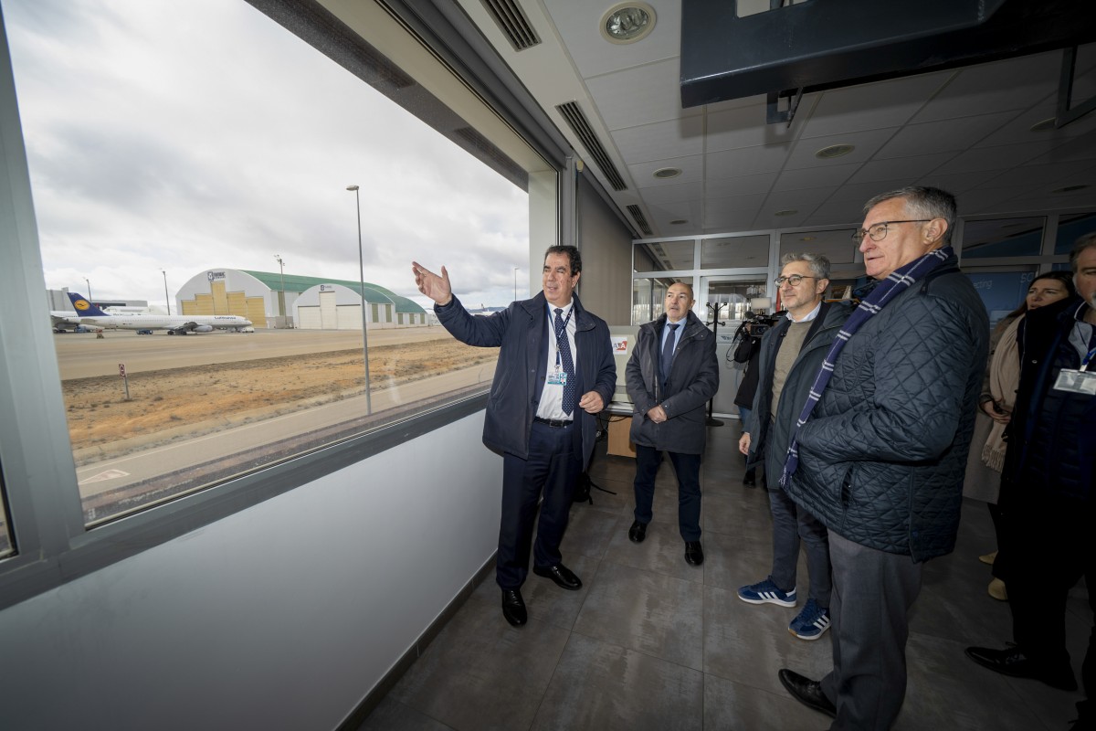 El consejero de Medio Ambiente y Turismo y responsable del Fite del Gobierno de Aragón, Manuel Blasco; el director gerente del Aeropuerto de Teruel, Alejandro Ibrahim; y el primer teniente de alcalde del Ayuntamiento de Teruel, Juan Carlos Cruzado, actuaron como anfitriones en esta visita institucional a la plataforma aeroportuaria, en la que Arcadi España estuvo acompañado por el delegado del Gobierno en Aragón, Fernando Beltrán; el subdelegado del Gobierno en Teruel, Enrique Gómez; y el diputado Herminio Sancho, entre otros representantes institucionales.