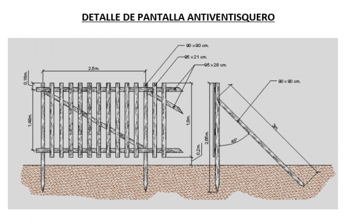Como nueva barrera a instalar se elige un tipo de pantalla en madera de pino, en módulos de 2,5 m de largo por 1,80 de alto, formada por pilares de 2,65 m de altura, dos tabloncillos horizontales de 2,5 m de longitud, diez unidades de tablas verticales de 1,80 m de longitud, un tabloncillo diagonal y dos arriostramientos de 3,00 m de longitud.