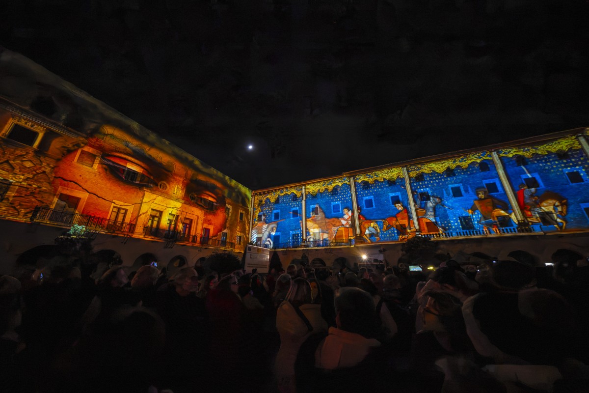 Así, sobre los cuatro lados de la plaza San Juan y sobre las seis fachadas de sus edificios pasaron las torres mudéjares, los personajes de la techumbre de la catedral, o el toro, símbolo de la ciudad, que “caminó” majestuoso por sus paredes solo con la fantasía que Siscar y su equipo se podrían imaginar, tras documentarse con la ayuda del Ayuntamiento y las fundaciones Amantes y Bodas de Isabel.