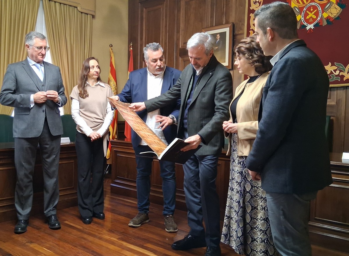 El libro reúne una gran cantidad de imágenes y además se completa con una reproducción de la techumbre mudéjar de la catedral de Teruel, cuyas tablillas, donde aparecen personajes de la época de los diferentes estamentos, sirven a los turolenses como fuente de inspiración, como le explicó la alcaldesa al presidente.