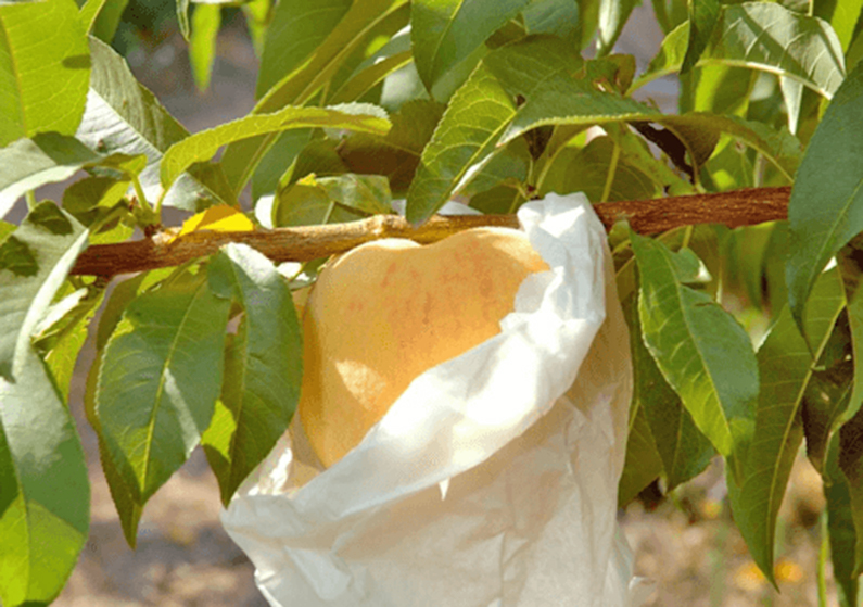 Lo que distingue a este melocotón es el uso exclusivo de la variedad amarillo tardío y las técnicas de aclareo y embolsado, que consisten en quitar el 70 % de los frutos existentes en el árbol hasta dejar una distancia cómoda de 20 centímetros entre fruto y fruto y, en los últimos 2 meses de crecimiento, embolsar uno a uno en el propio árbol. De este modo, madura dentro de una bolsa protectora que garantiza su pureza ya que no entra en contacto con ningún tipo de productos fitosanitarios ni con agentes externos.