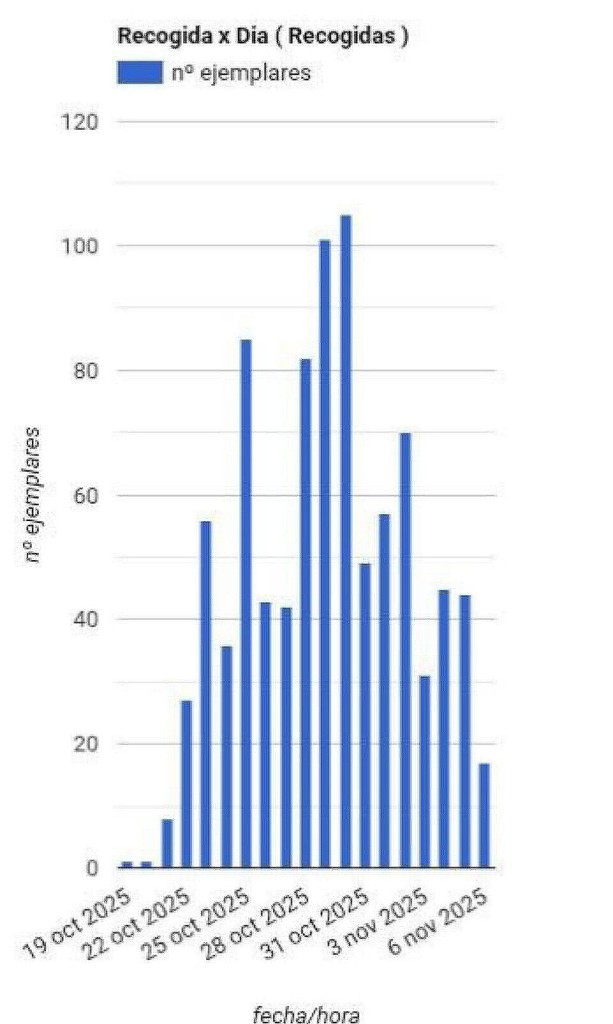 El trazado que dibuja la gráfica donde se recogen las aves muertas por días muestra que en los últimos días ha habido menos decesos, algo que Pérez valora positivamente. Sin embargo, alerta de que con la bajada de las temperaturas puede intensificarse la llegada de las aves migratorias, lo que posiblemente provocará un repunte en los contagios.