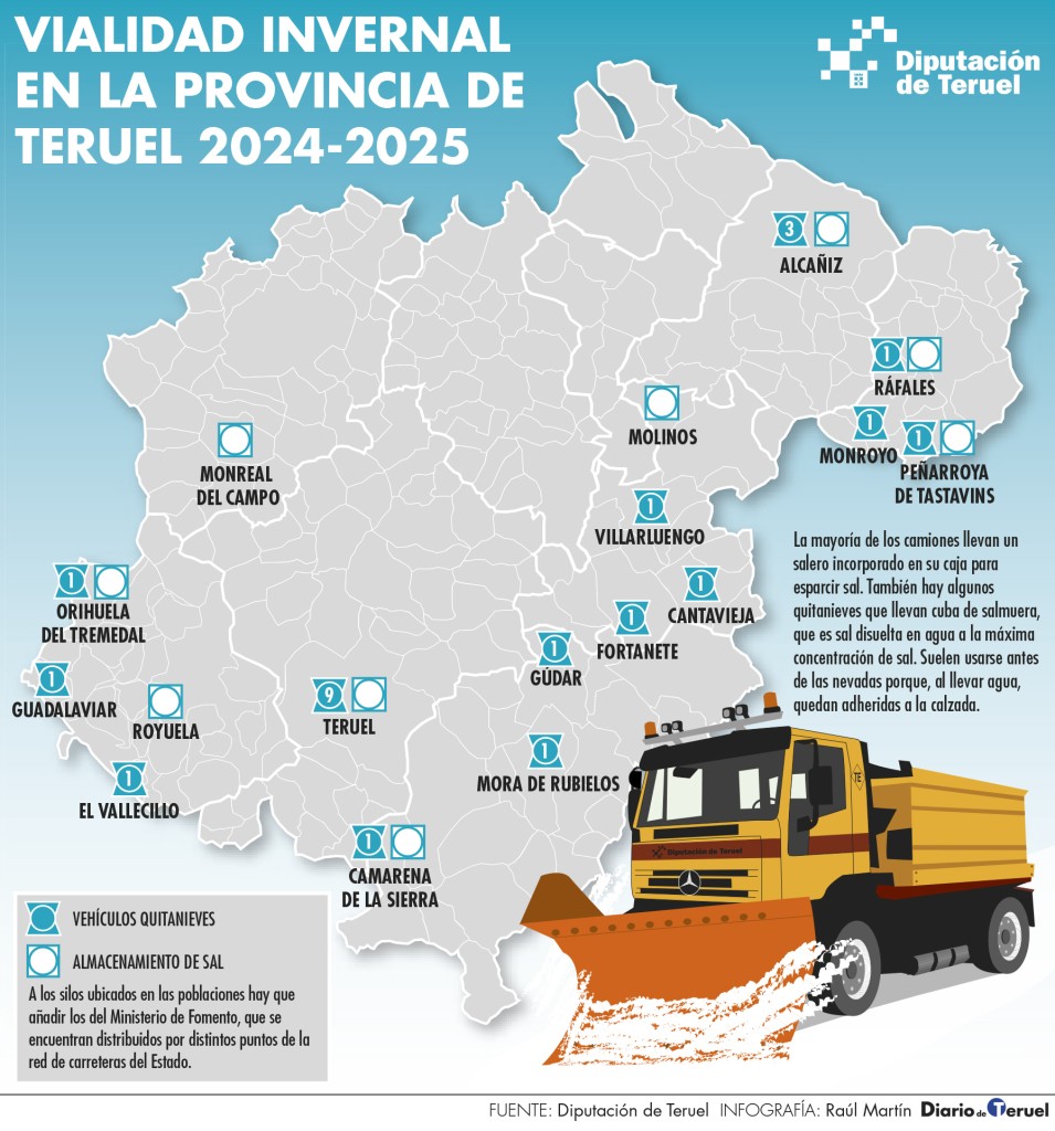 La DPT despliega 24 equipos en el dispositivo invernal con 18 camiones con distintas tracciones, más un furgón camioneta y tres vehículos ligeros, todos ellos dotados de equipos de vialidad invernal. El centro de operaciones de Teruel cuenta con nueve equipos, tres en Alcañiz y otros doce equipos conveniados con otras administraciones.