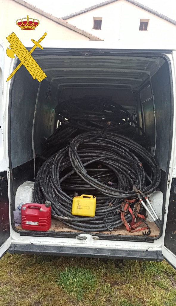 Además del cable, se han intervenido una furgoneta, herramienta de corte, crampones para subir a través de los postes de madera y garrafas de combustible para quemar la cobertura plástica del cable al objeto de obtener como resultado cobre limpio, lo que aumentaría su valor.