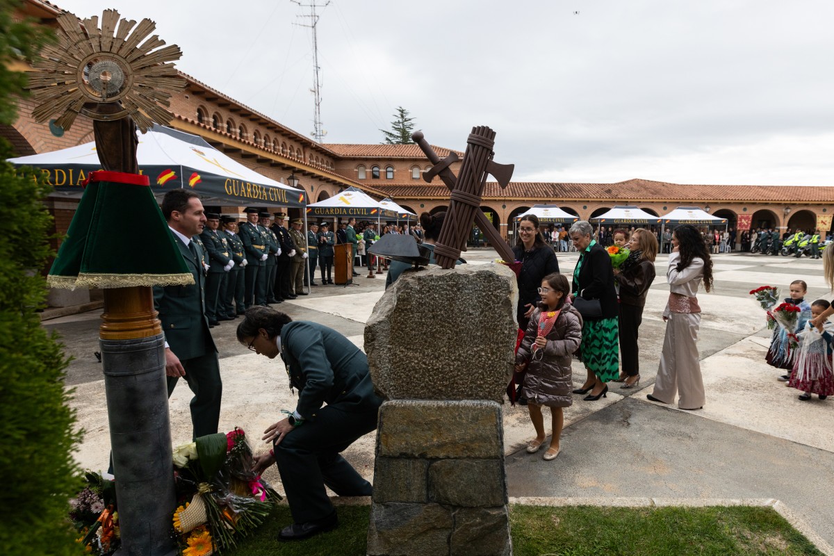 A los acordes de la jota, y como preámbulo al homenaje a los Caídos, se inició el depósito de flores a los pies del monolito de la Virgen del Pilar. Sonaba la jota y multitud de personas, hombres, mujeres y niños, familiares y amigos del Cuerpo de la Guardia Civil no quisieron perder la ocasión de agasajar a la patrona.