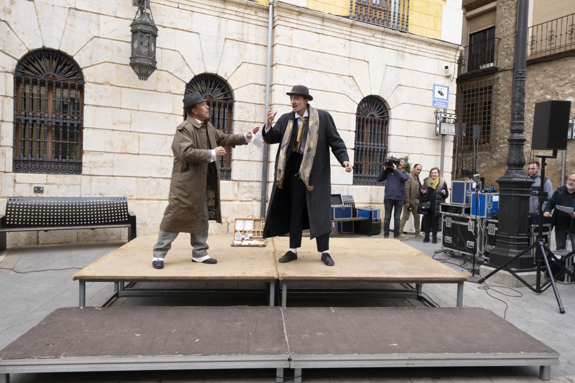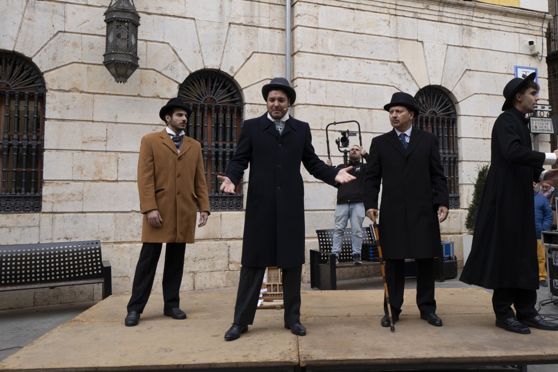 Los actores de la Fundación Bodas de Isabel interpretan a los astrónomos de la épocaTeruel ha vuelto a echar marcha atrás las agujas del reloj y en esta ocasión se ha parado en el año 1909. Entonces España se preparaba para la llegada del cometa Halley. Algunos lo veían como una oportunidad para conocer más sobre las estrellas, en Teruel, “donde tienen el mejor cielo de todo el país”, otros, como la llegada del fin del mundo. Un ejemplo de apocalípticos e integrados, donde también tenía cabida los que se aprovechaban del momento y solo veían el negocio. Esta revuelta sociedad de principios del siglo XX se puso sobre el escenario en la plaza de la Catedral en una divertida representación interpretada por los actores voluntarios de la Fundación Bodas de Isabel.